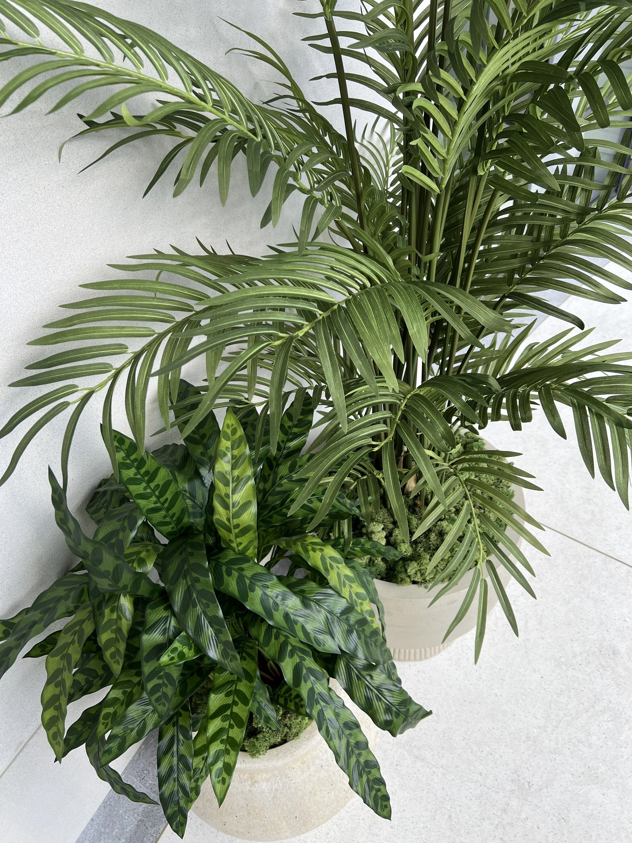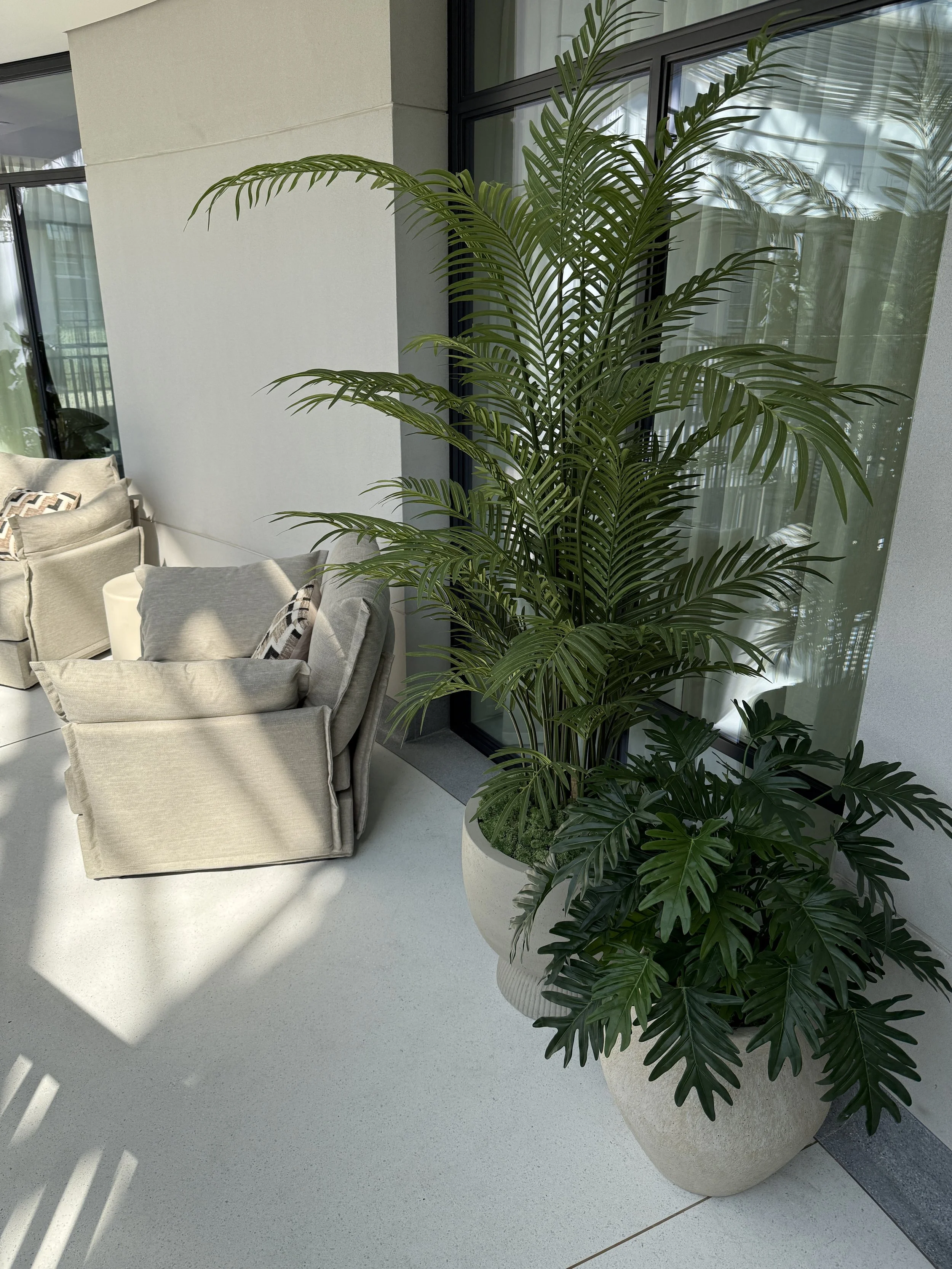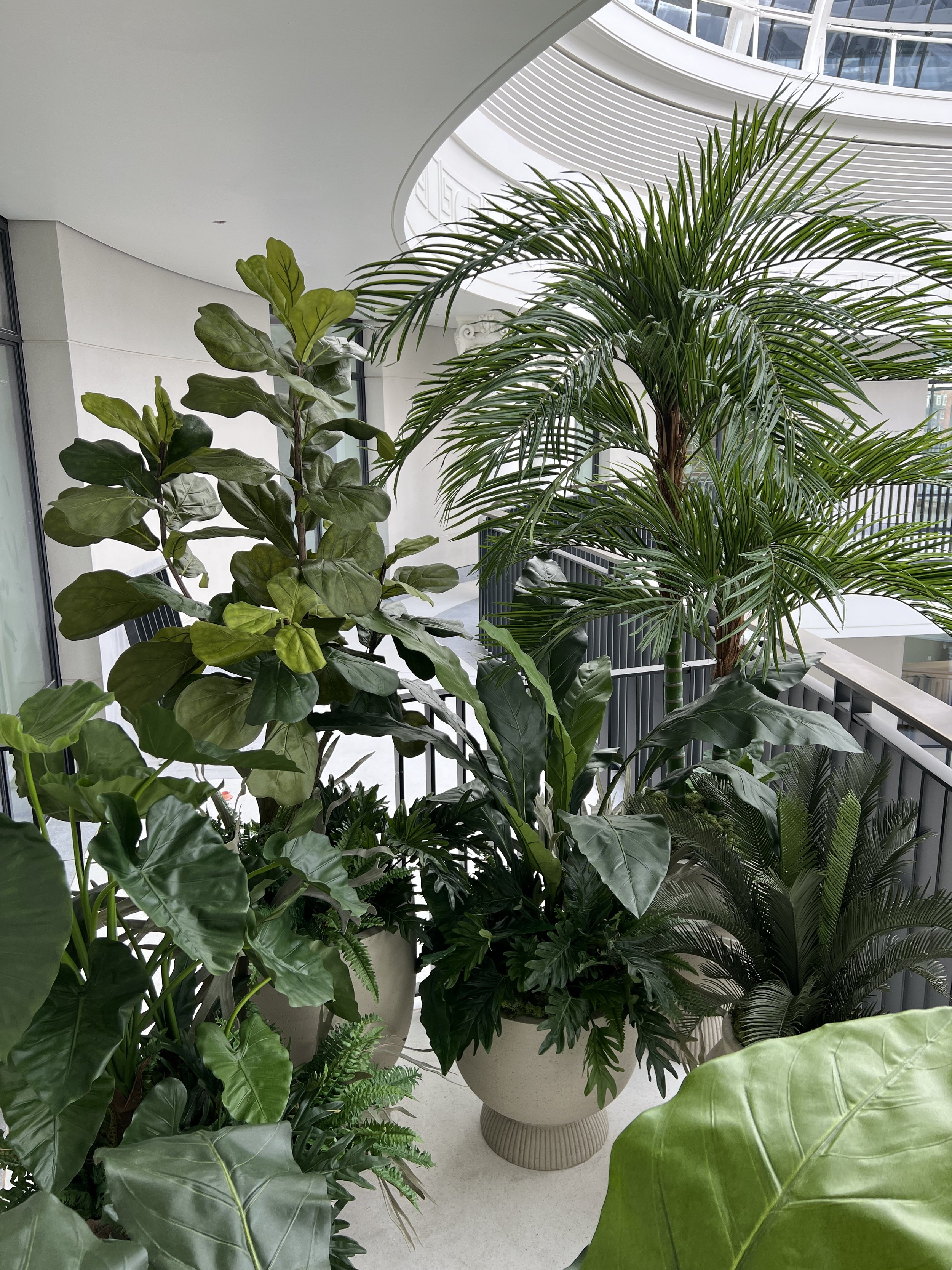 This indoor balcony space required some sizeable plant displays and the client wanted a completely tropical look. Due to the nature of the environment of this indoor/outdoor area and the client’s own personal preferences we opted for a range of high quality and realistic artificial plants.