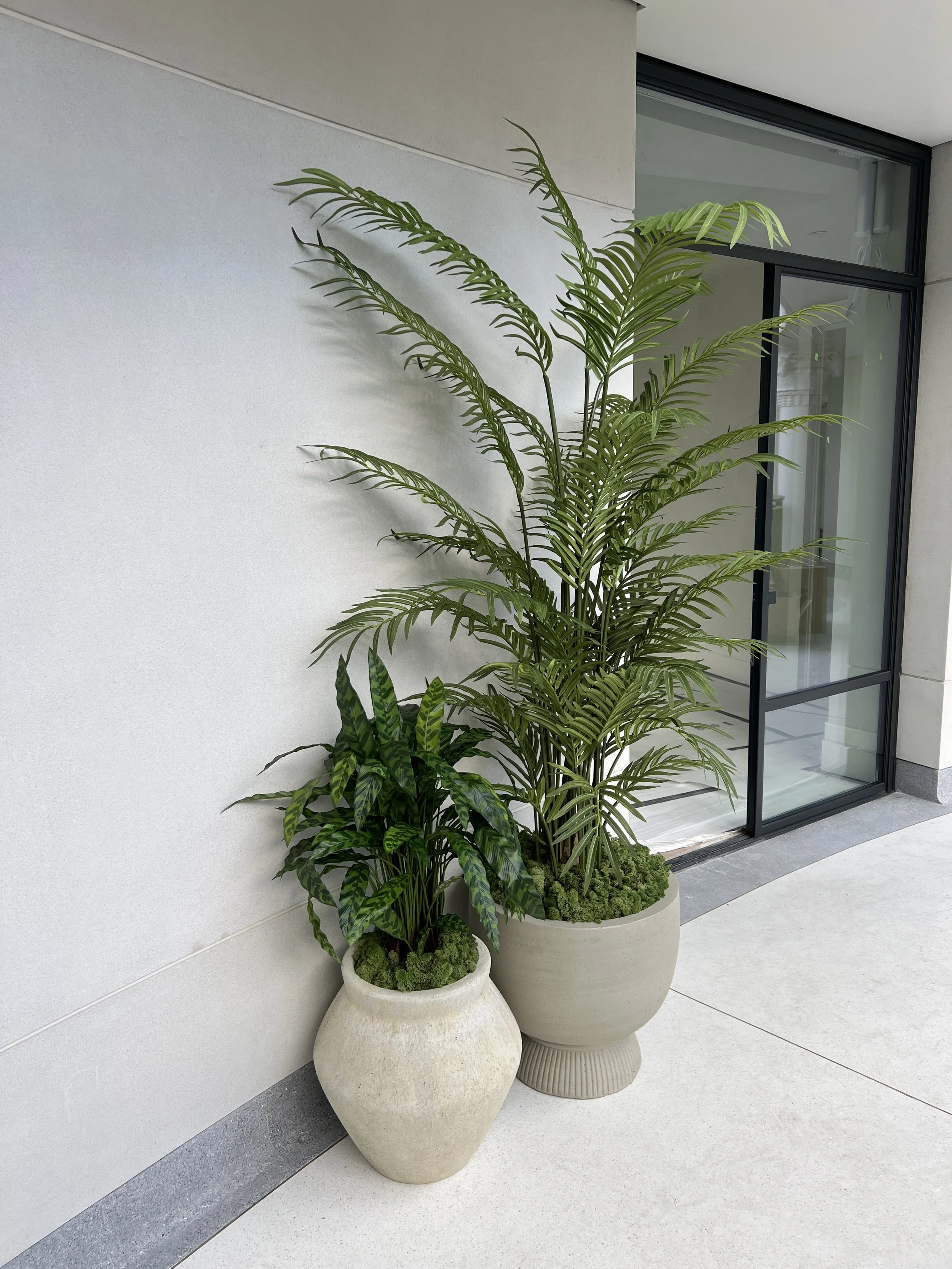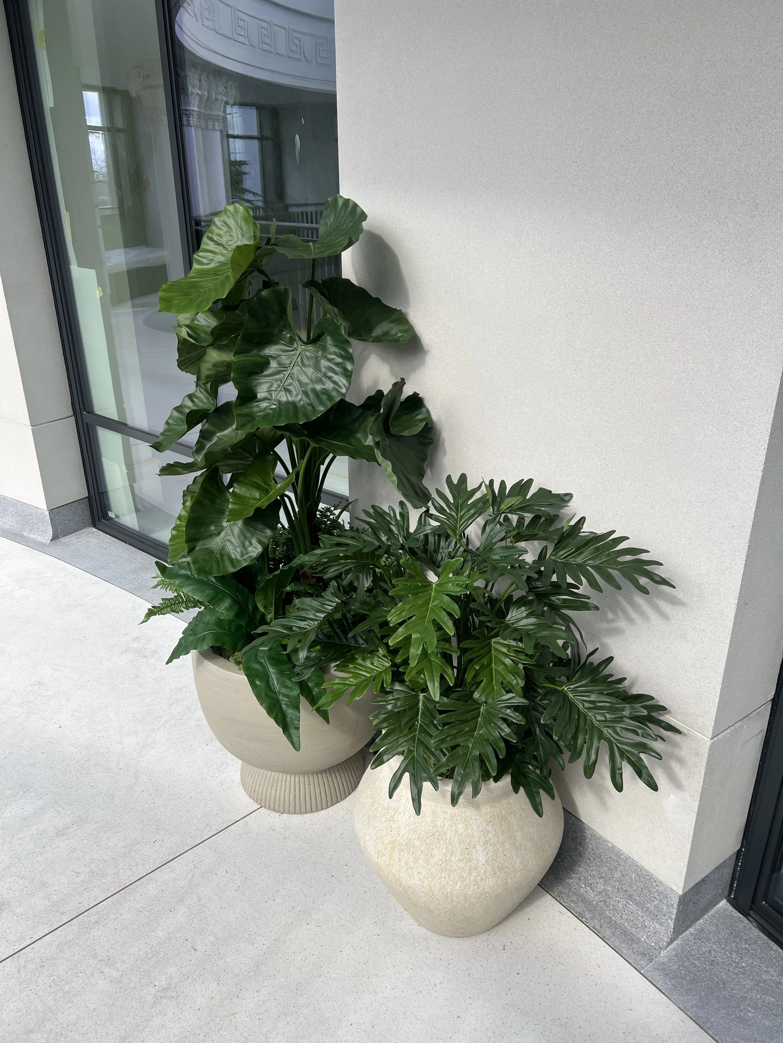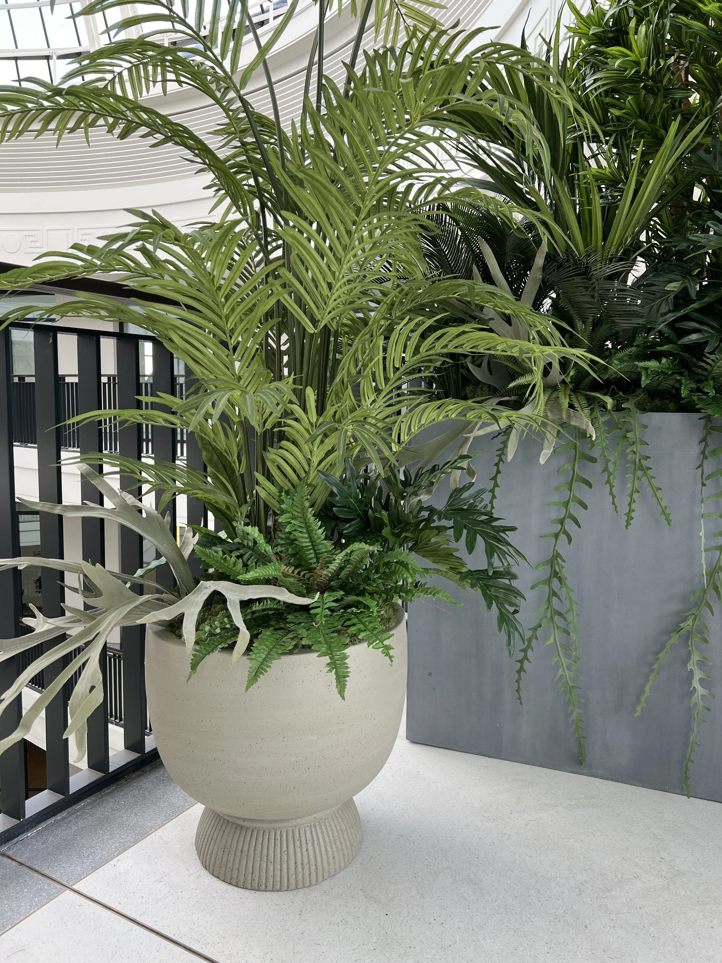 The plants were styled in contemporary yet classic indoor pots and planters to mimic the design of the newly developed building and the restored architectural elements architecture of the large room.